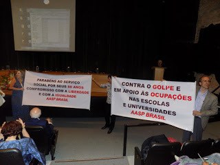 Aproveitando o momento, a AASP Brasil levou duas faixas para mostrar aos presentes nossas mensagens: uma parabenizando os 80 anos do Serviço Social e outra em apoio às ocupações das escolas e universidades pelos estudantes em todo o país, contra o golpe e as propostas do atual governo.